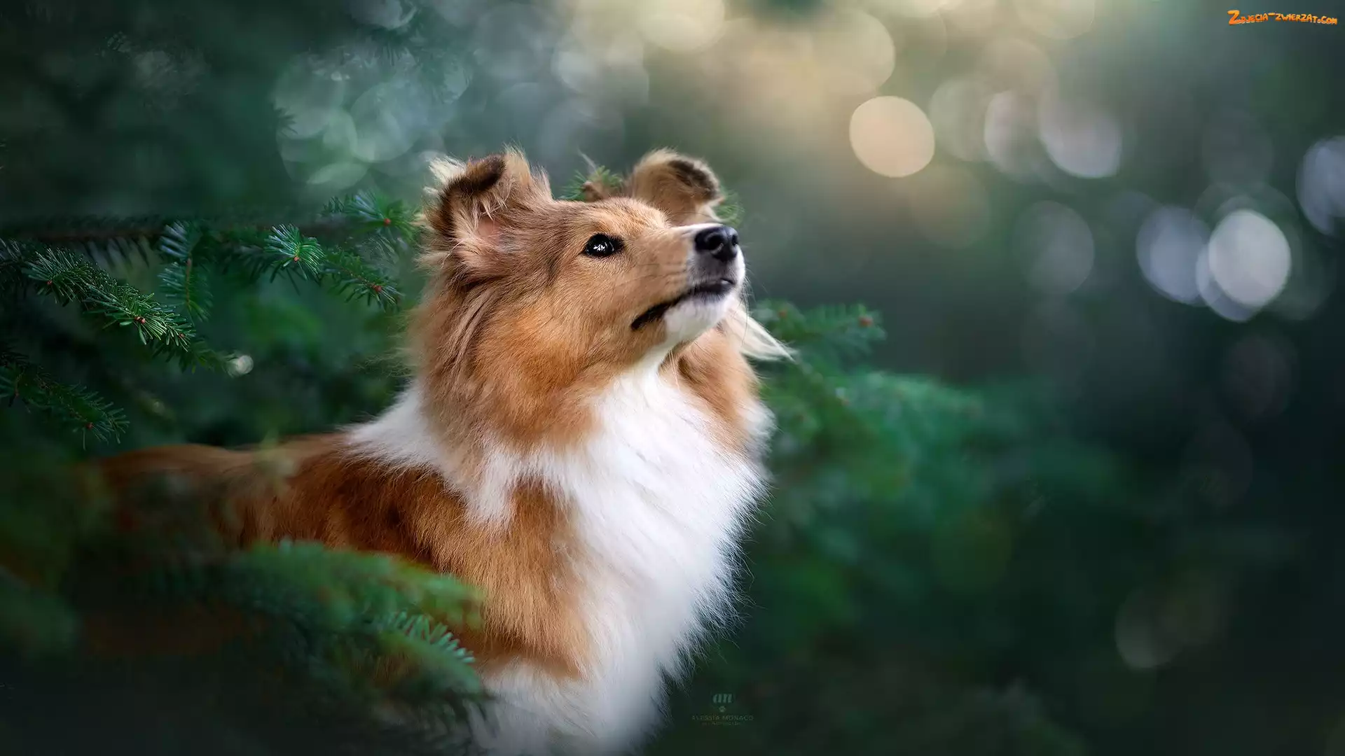 Zdjęcie: Pies, Owczarek szetlandzki, Świerk, Gałązki