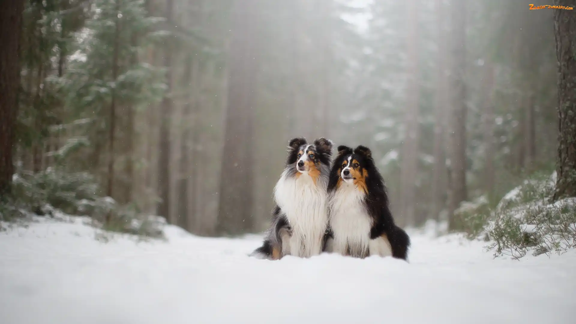 Zdjęcie: Owczarki szetlandzkie, Las, Psy, Śnieg