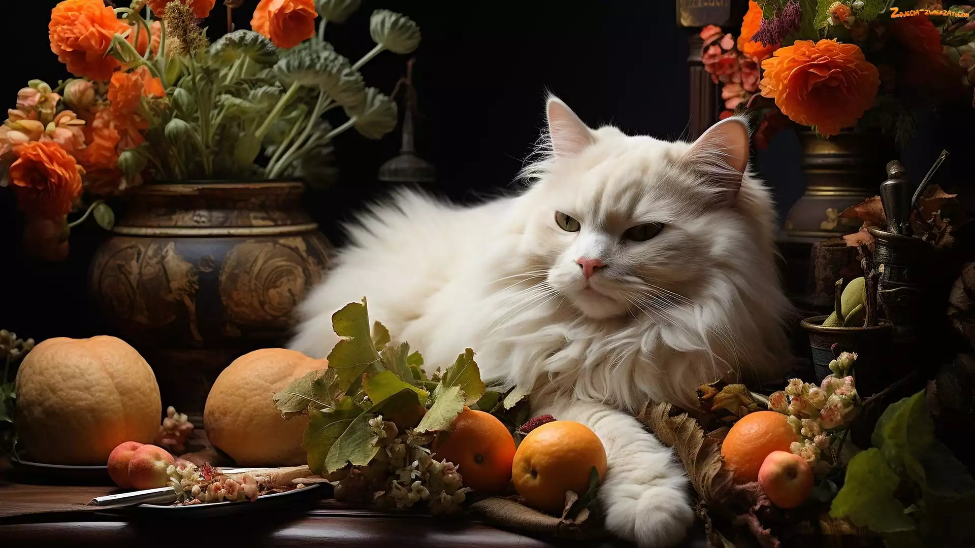 Zdjęcie: Owoce, Kot, Kwiaty