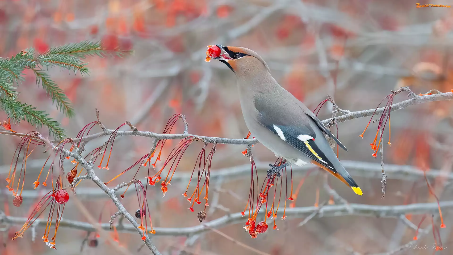 Gałązki, Owoce, Ptak, Jemiołuszka, Czerwone