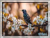 Grafika AI, Gałązka, Ptak, Szpak, Kwiaty, Drzewo owocowe