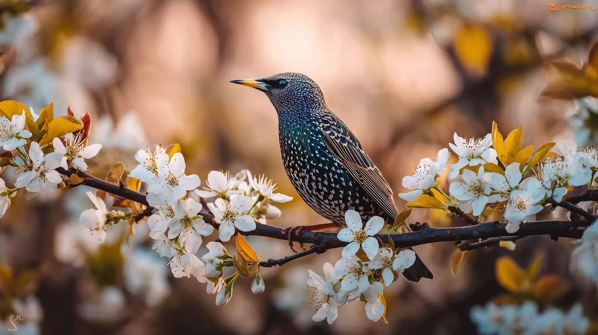 Zdjęcie: Grafika AI, Gałązka, Ptak, Szpak, Kwiaty, Drzewo owocowe