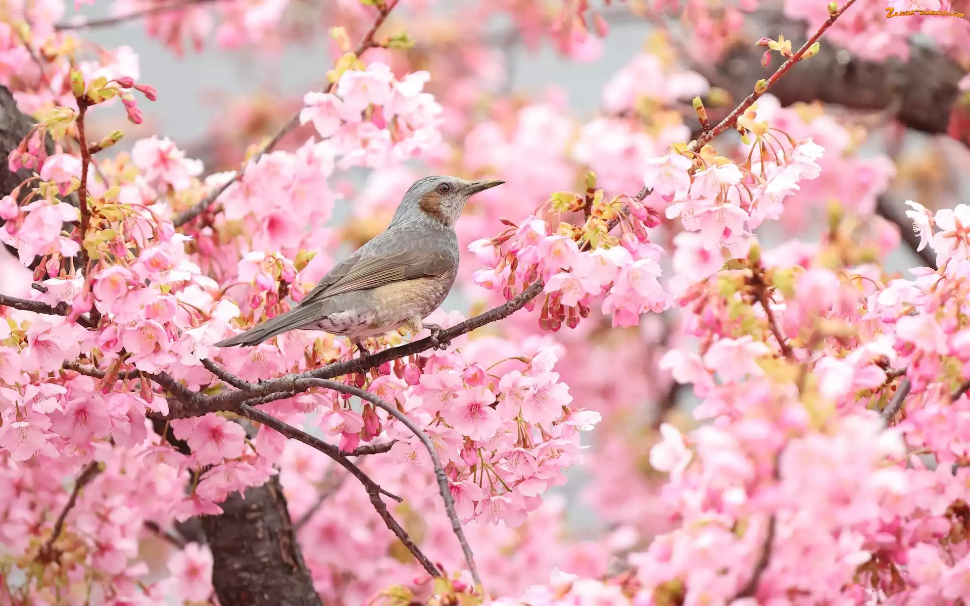 Zdjęcie: Wiśnia, Różowe, Ptak, Szczeciak rudouchy, Kwiaty, Drzewo owocowe