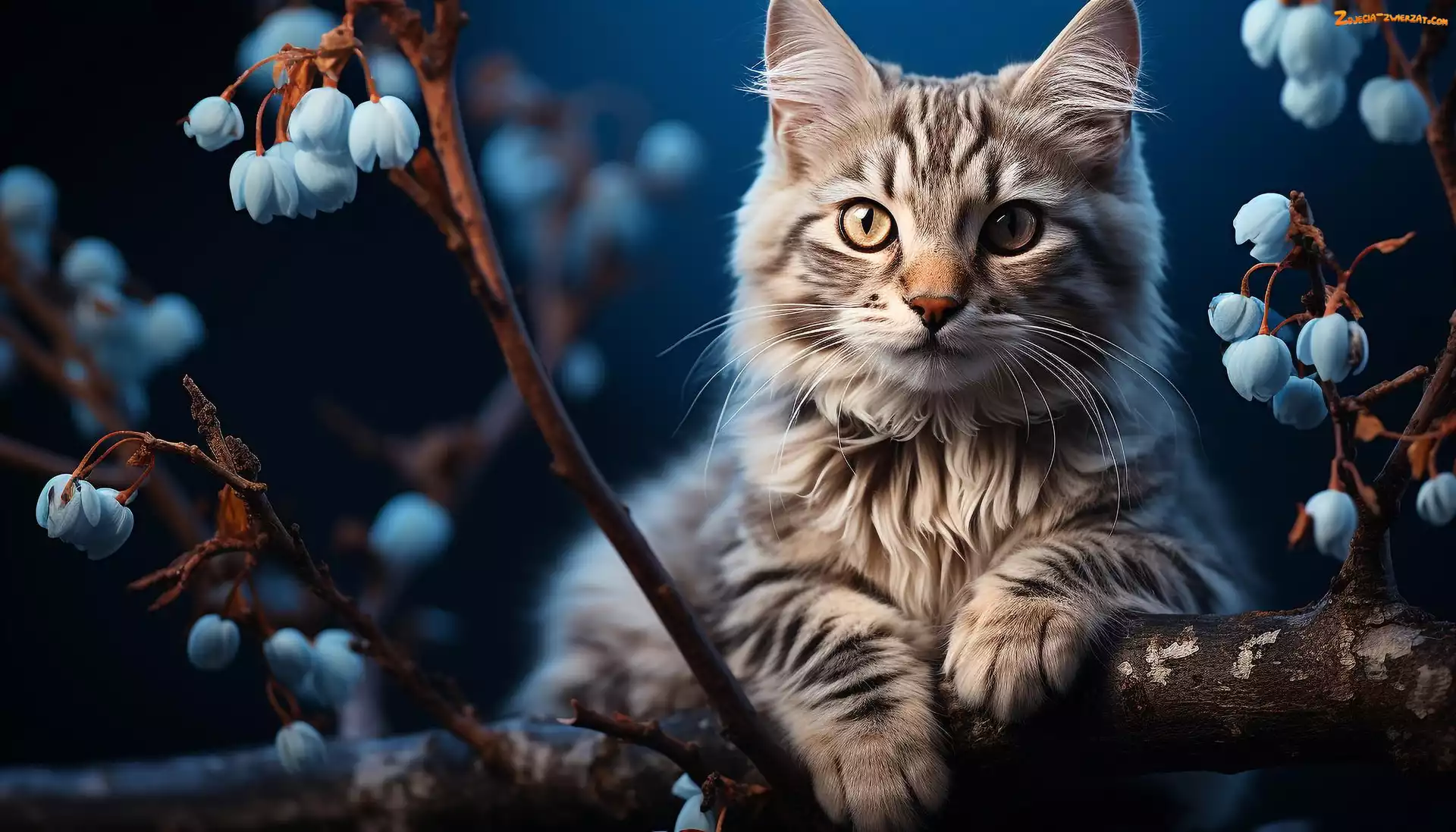 Zdjęcie: Kot, Gałąź, Niebieskie, Pąki