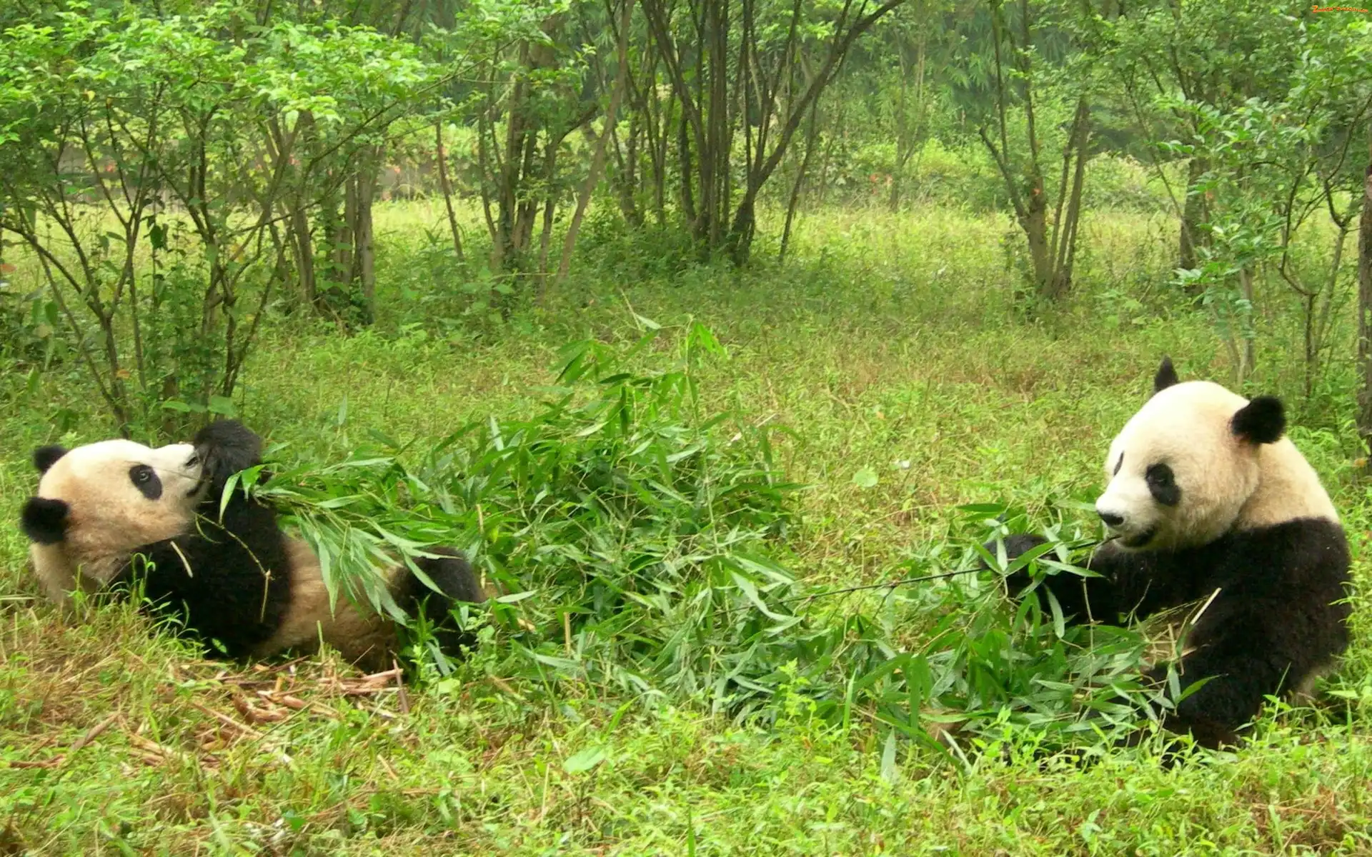 Zdjęcie: Pandy, Trawa, Dwie, Drzewa