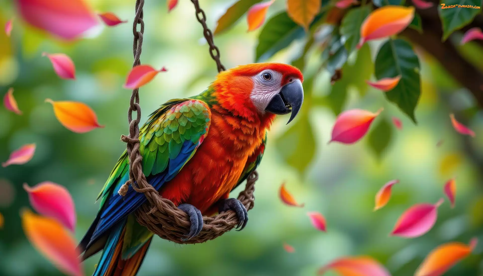 Zdjęcie: Grafika AI, Huśtawka, Papuga, Ara, Opadające, Liście
