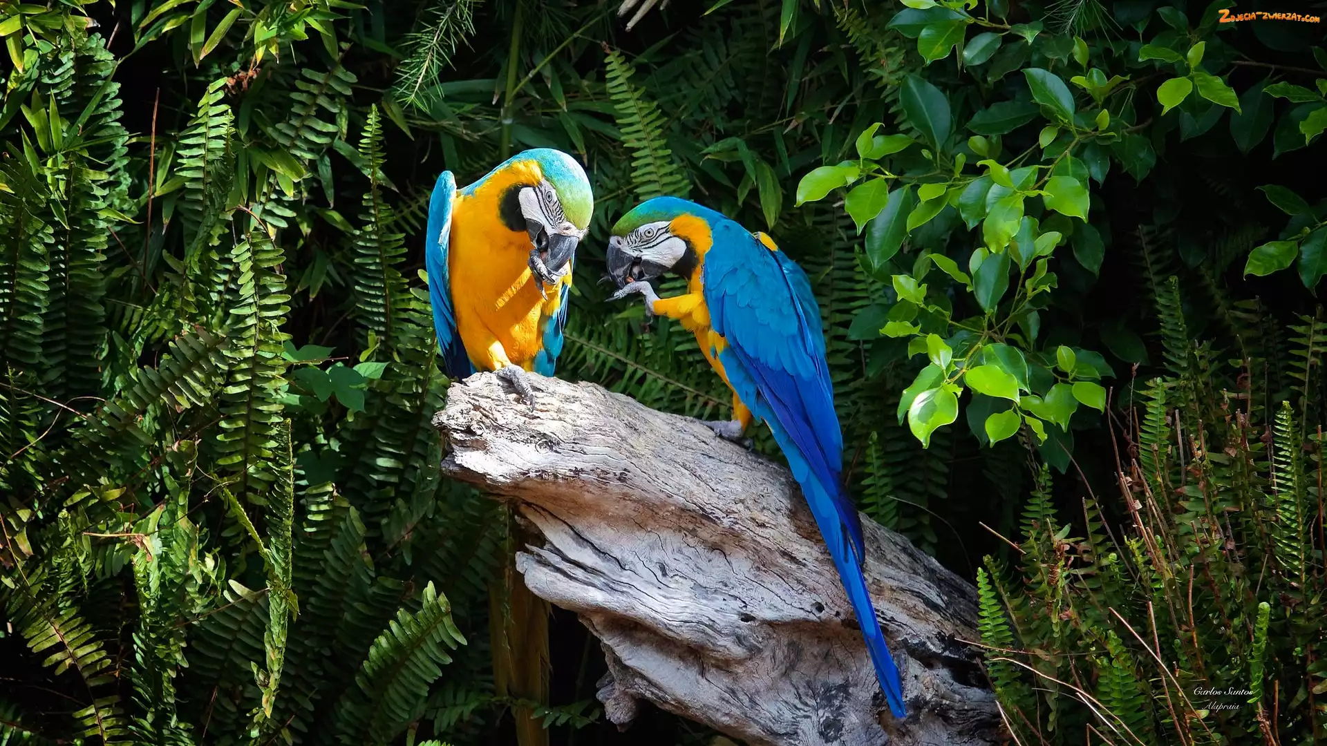 Zdjęcie: Paprocie, Papugi, Dwie, Pień, Liście, Niebiesko-żółte, Ary