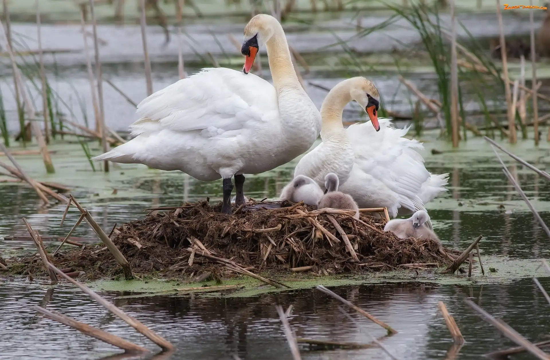 Zdjęcie: Łabędzi, Gniazdo, Para, Młode
