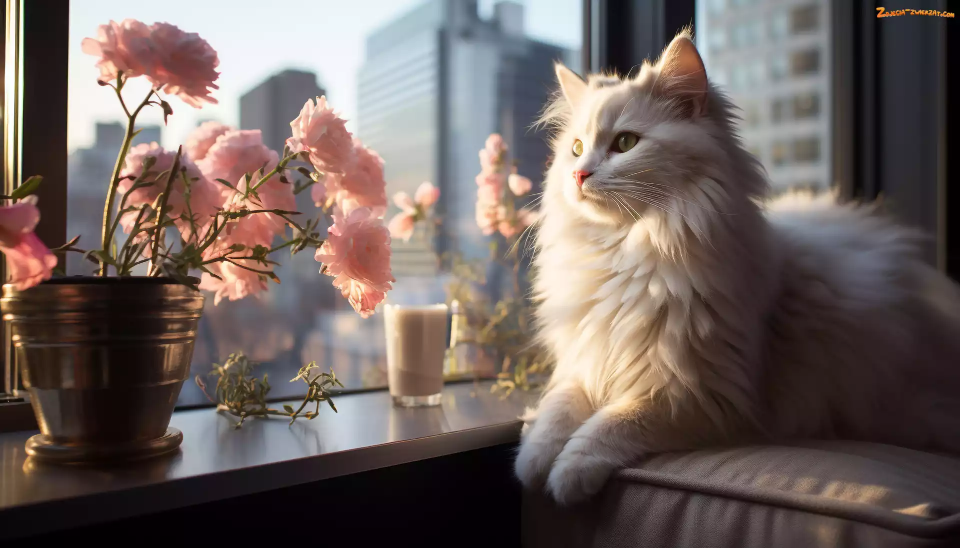 Zdjęcie: Kwiaty, Parapet, Grafika, Kot, Okno