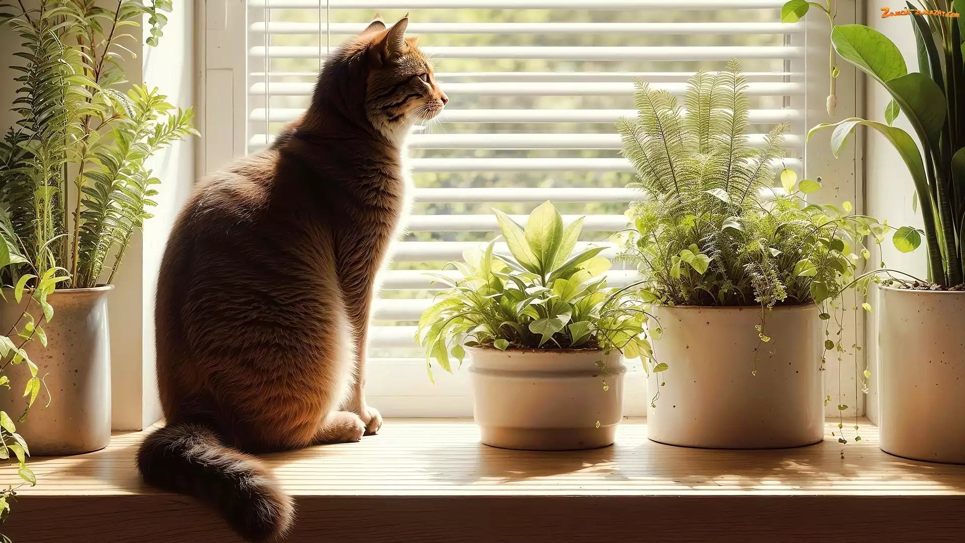 Zdjęcie: Kot, Okno, Rośliny, Parapet