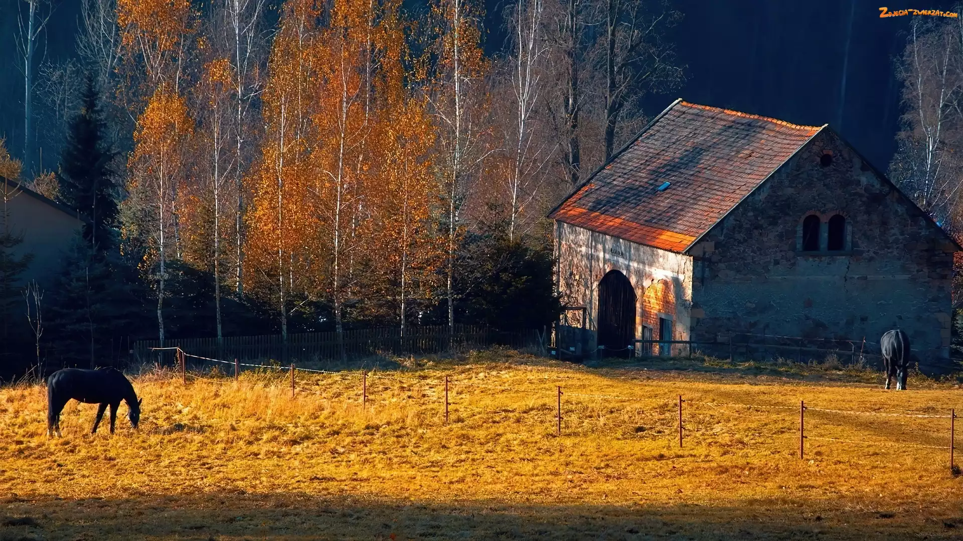 Zdjęcie: Konie, Pastwisko, Drzewa, Szopa