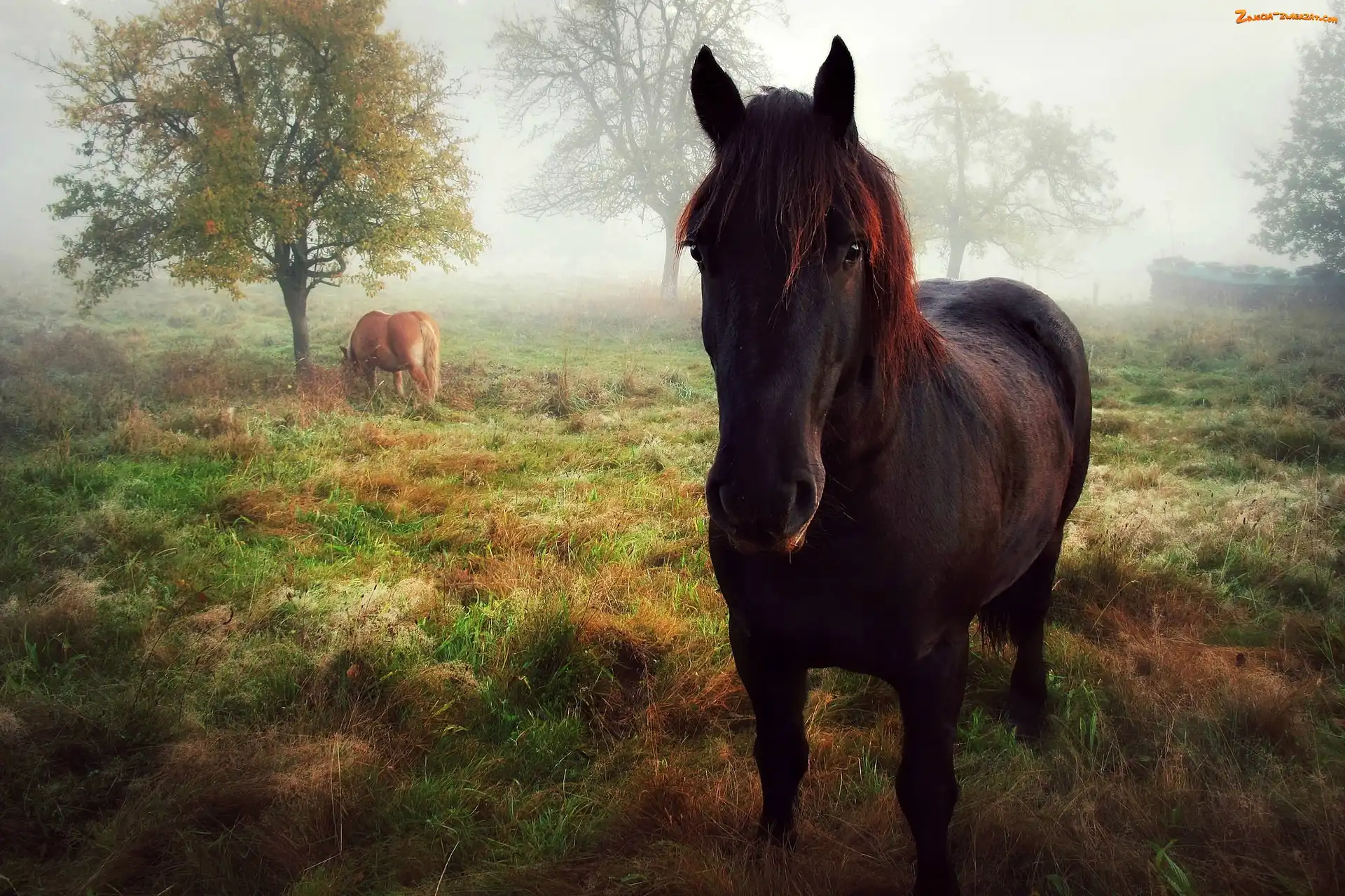 Zdjęcie: Pastwisko, Mgła, Konie, Poranek