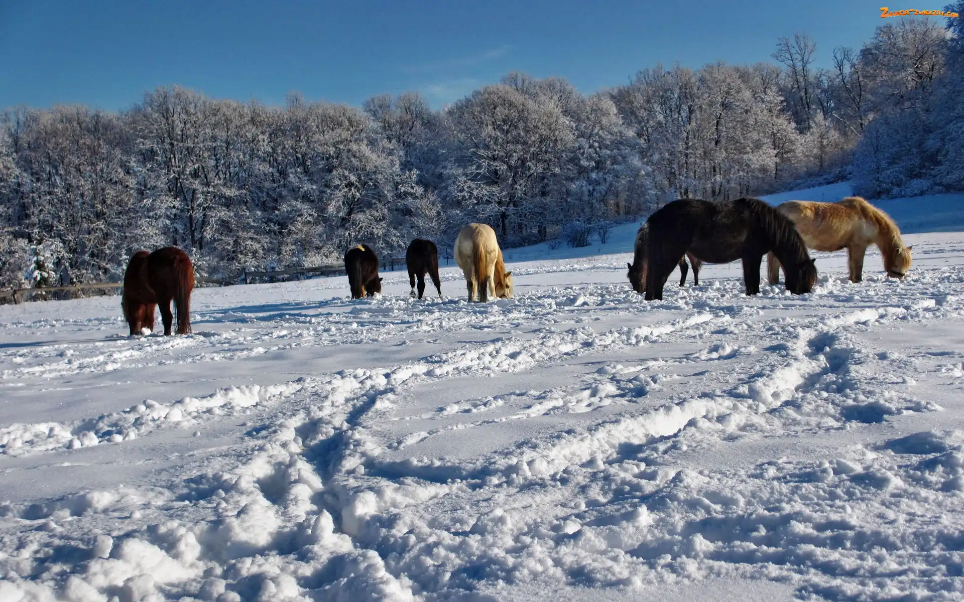 Zdjęcie: Pastwisko, Śniegiem, Zima, Konie, Zasypane