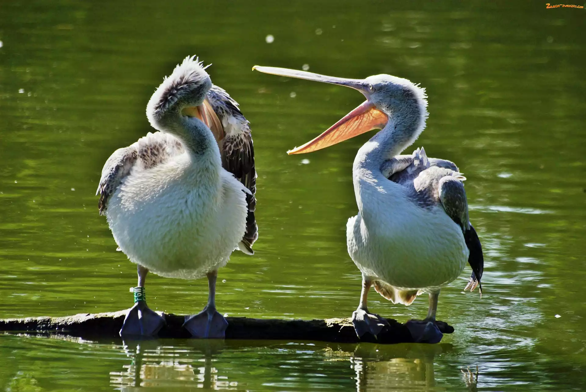 Zdjęcie: Pelikany, Woda, Dwa, Kłoda