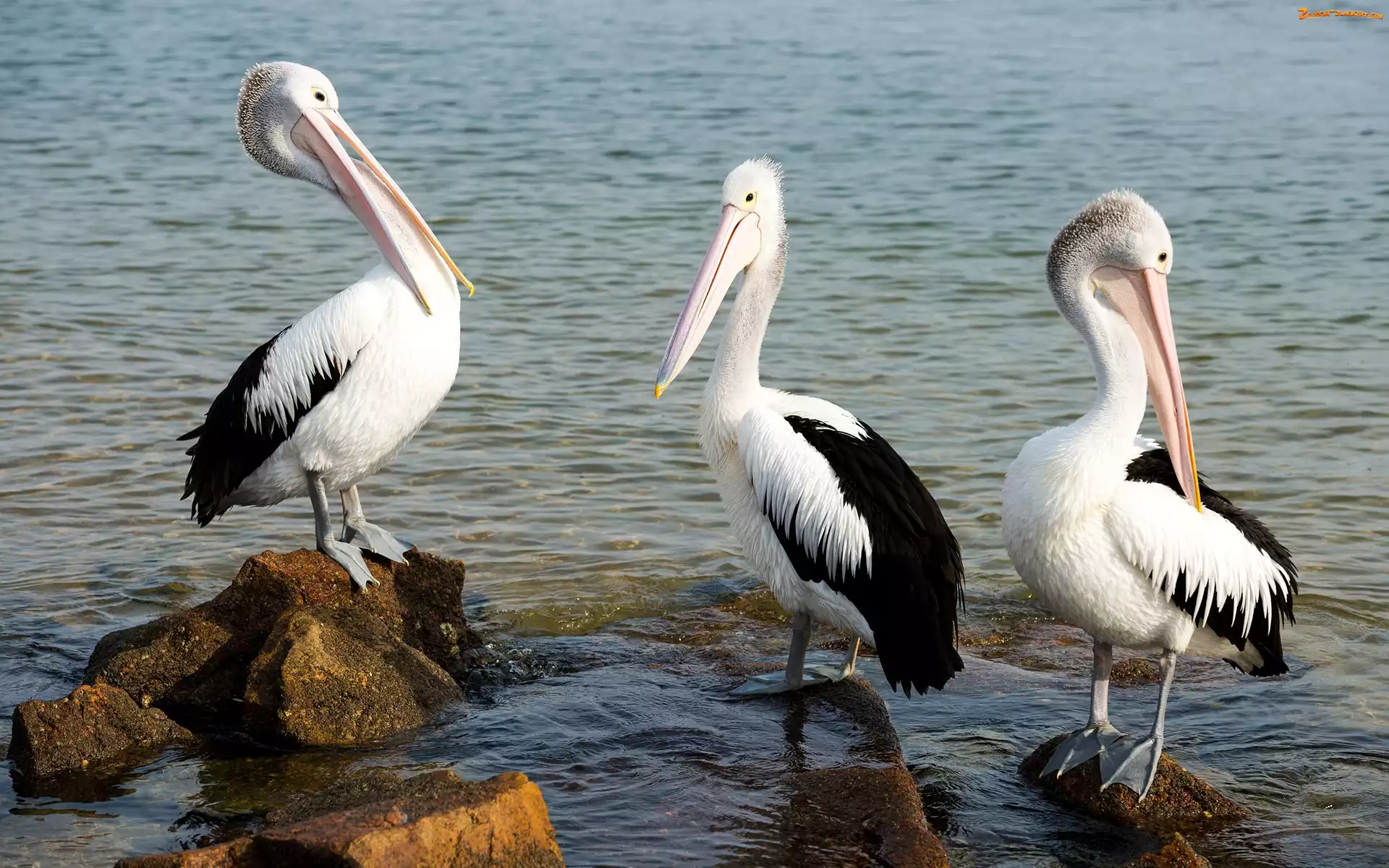 Kamienie, Pelikany, Morze, Ptaki, Trzy