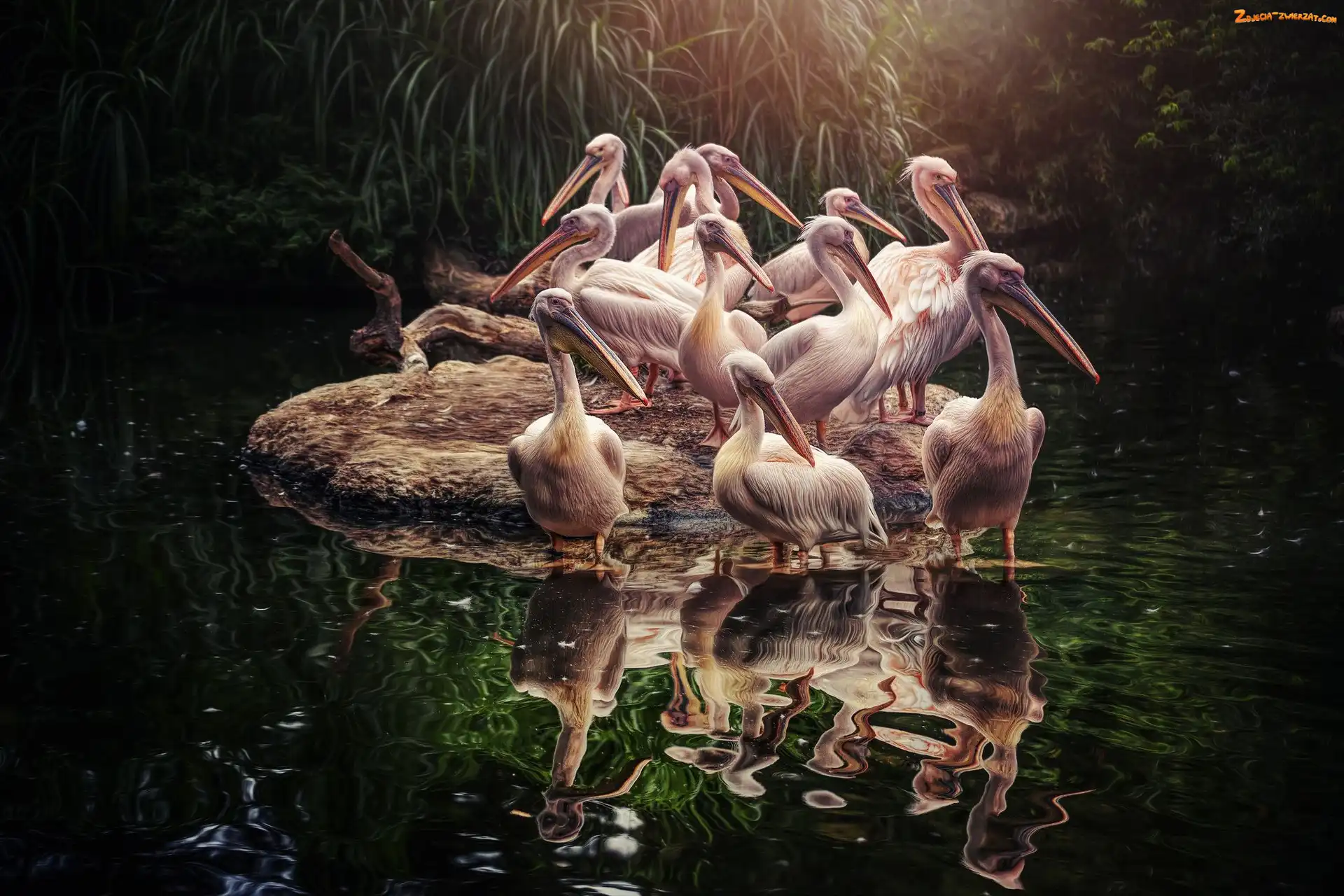Zdjęcie: Pelikany, Staw, Ptaki, Kamień