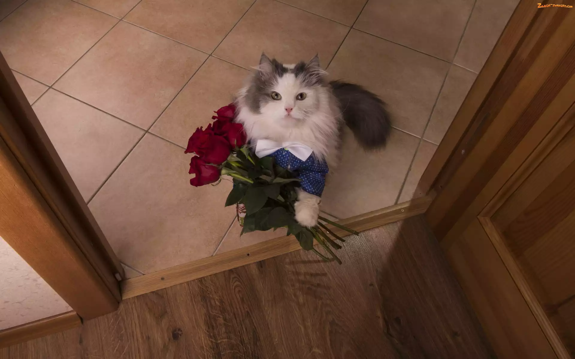 Zdjęcie: Bukiet, Maine coon, Szarobiały, Kwiaty, Róże, Kot, Ubranko