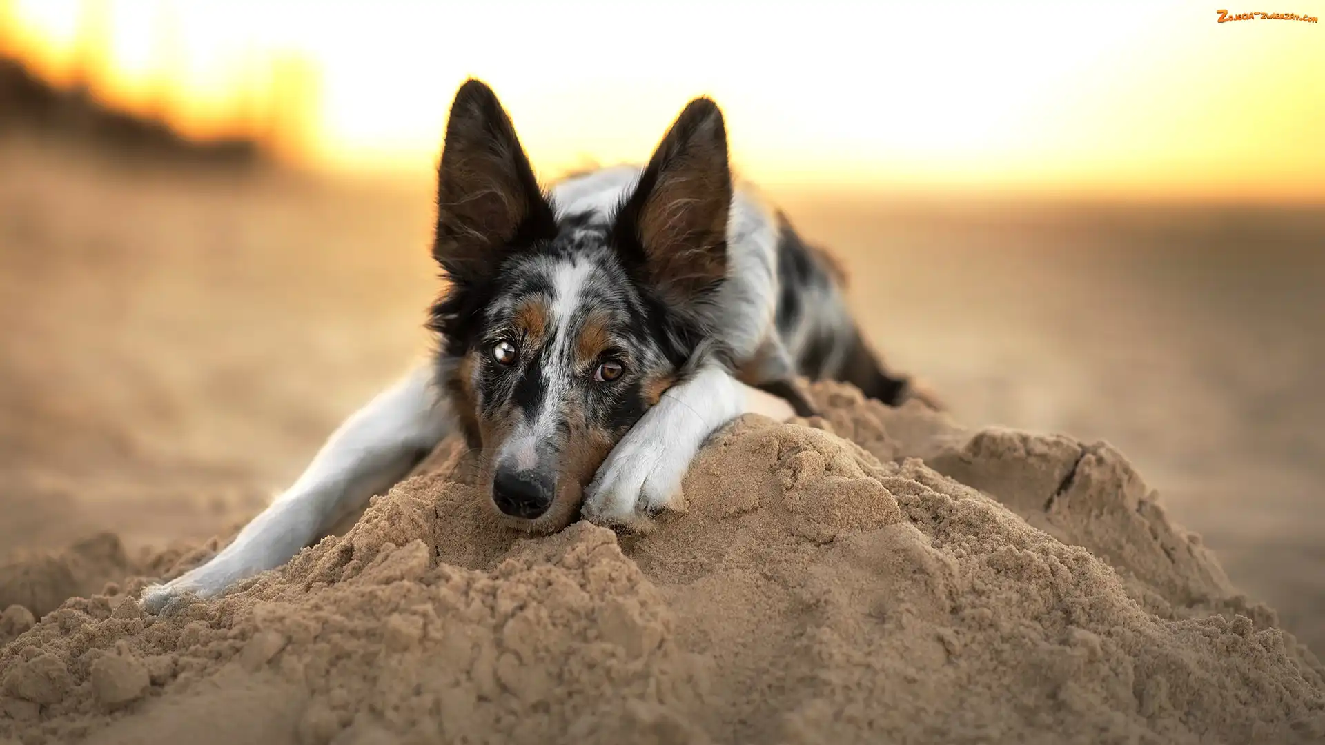 Zdjęcie: Piasek, Mordka, Pies, Leżący, Border collie
