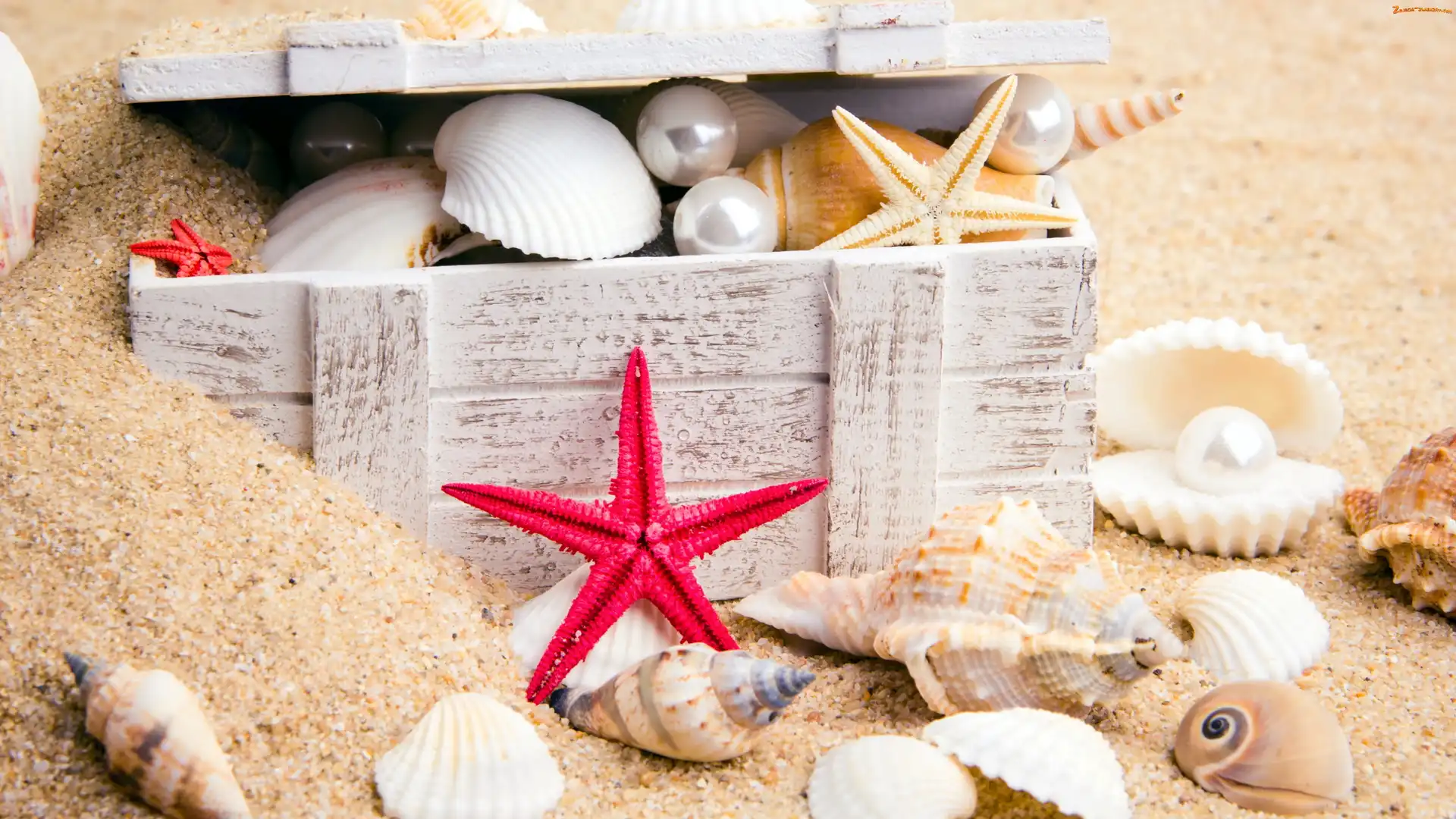 Piasek, Skrzynka, Perły, Muszelki, Rozgwiazdy