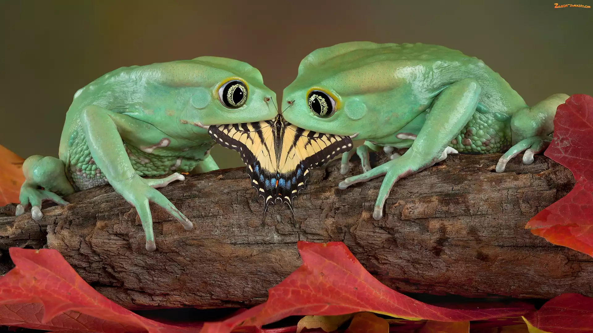 Zdjęcie: Pień, Motyl, Zielone, Dwie, Żaby
