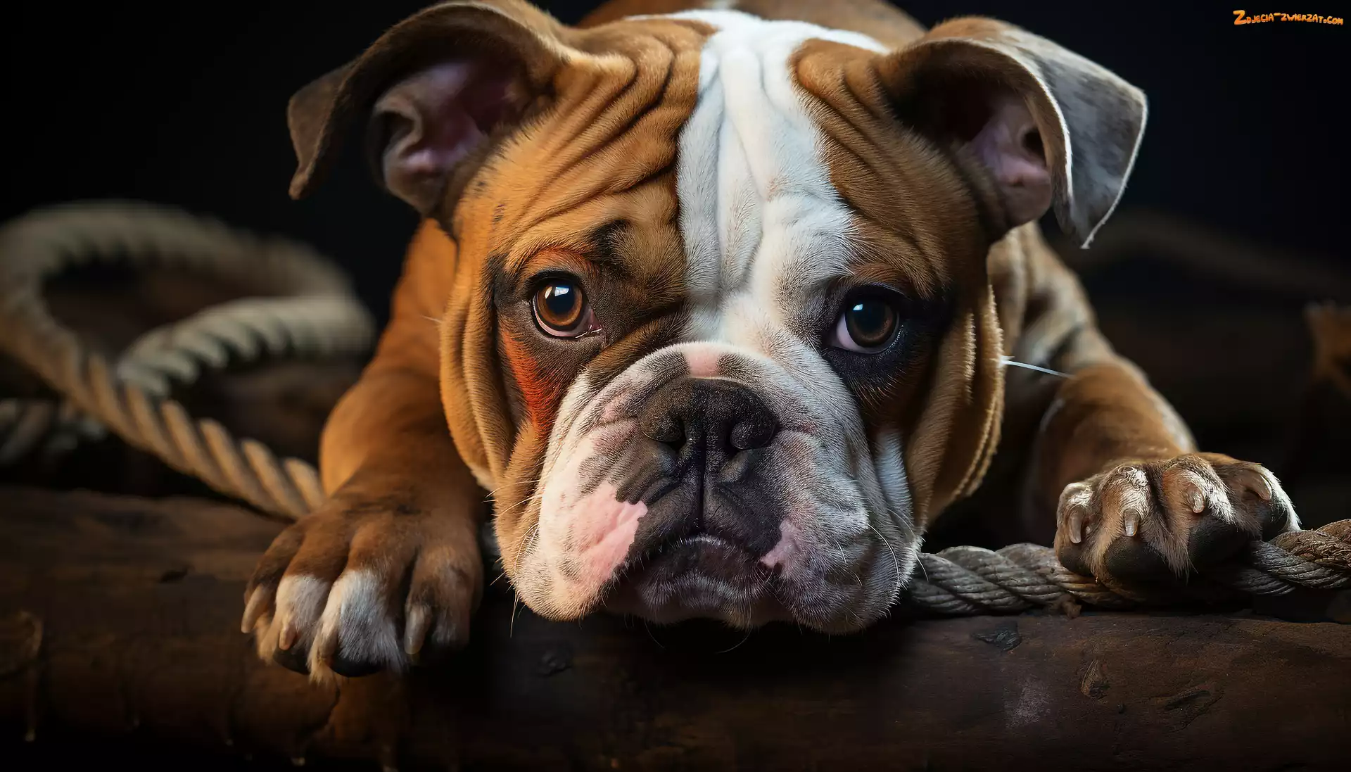 Zdjęcie: Drewno, Buldog angielski, Pies, Szczeniak, Spojrzenie, Lina