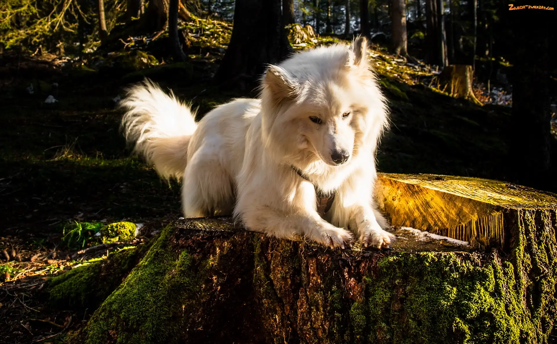Zdjęcie: Pies, Pniak, Biały, Drzewa