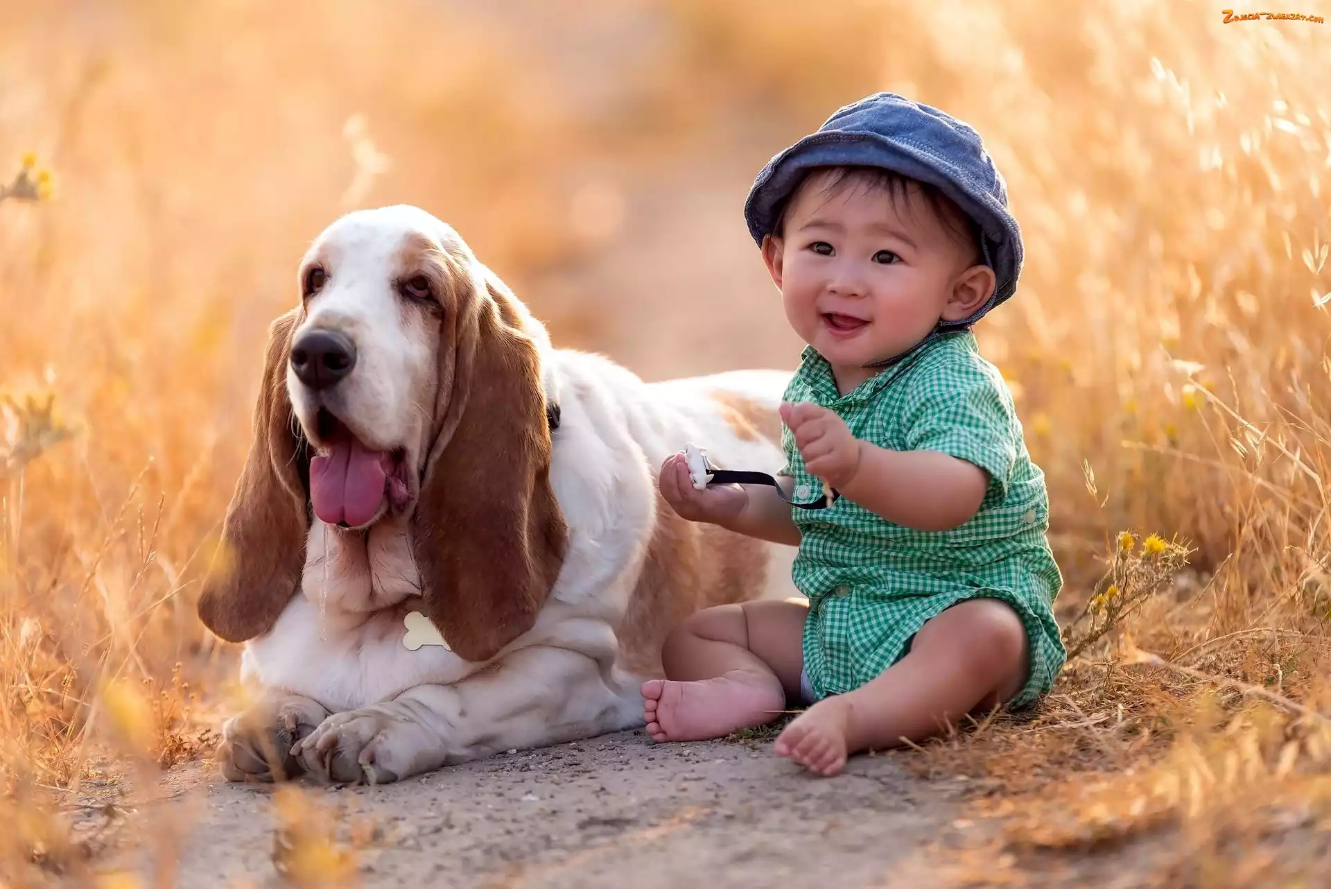 Pies, Mały, Trawa, Łąka, Chłopczyk, Basset