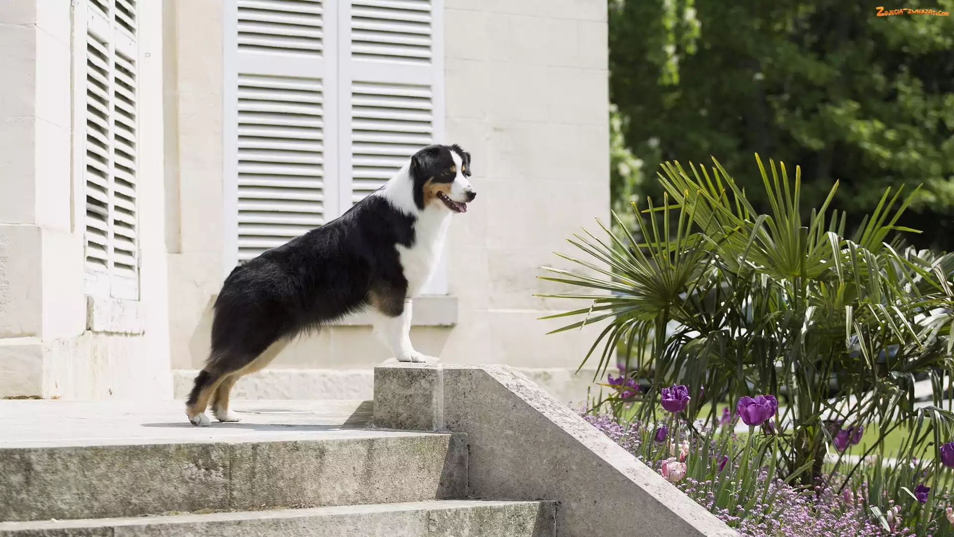 Zdjęcie: Dom, Pies, Palma, Tulipany, Owczarek australijski, Schody