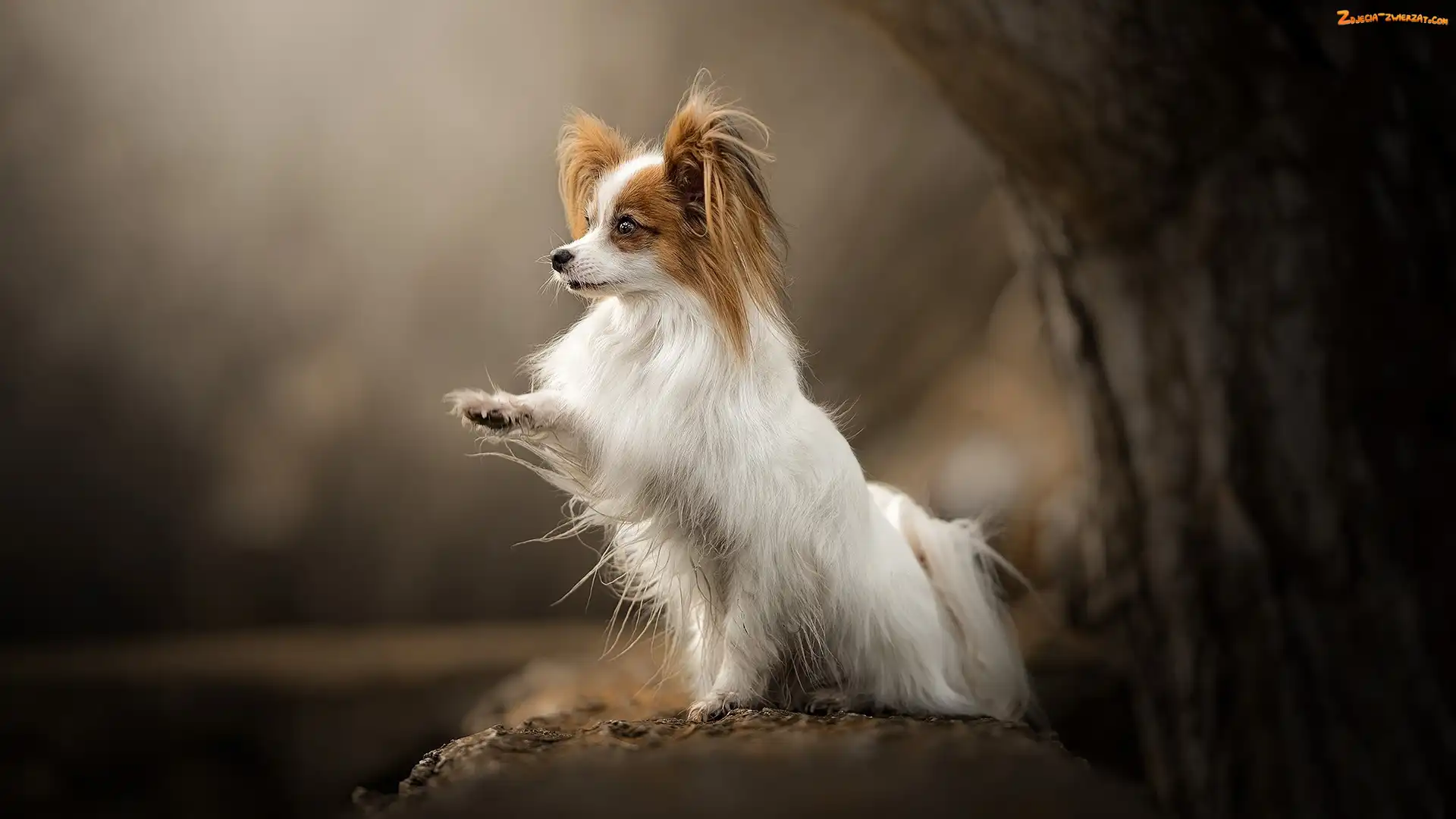 Zdjęcie: Papillon, Pies, Tło, Rozmyte, Spaniel kontynentalny miniaturowy, Drzewo
