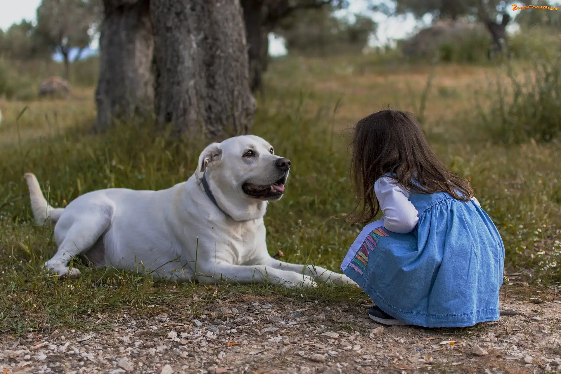 Zdjęcie: Pies, Drzewa, Dziewczynka, Trawa