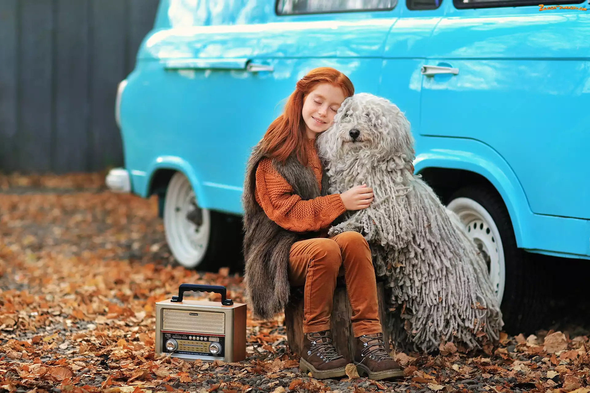 Zdjęcie: Pies, Rudowłosa, Radio, Przytulenie, Dziewczynka, Puli