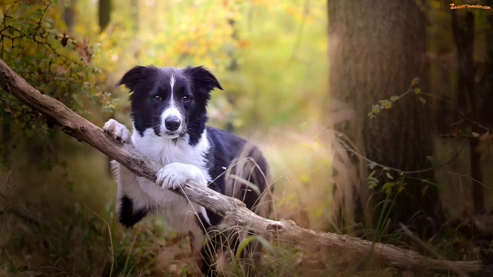 Zdjęcie: Gałąź, Pies, Trawa, Drzewa, Border collie, Las