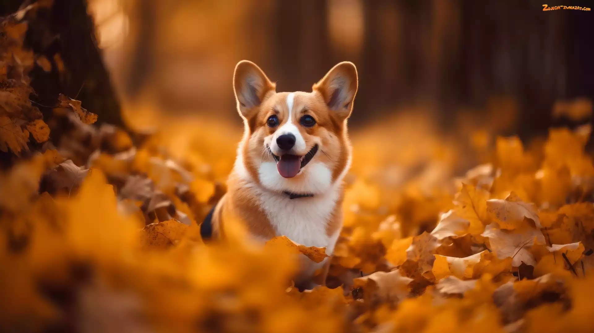 Jesień, Liście, Grafika, Pies, Welsh corgi pembroke