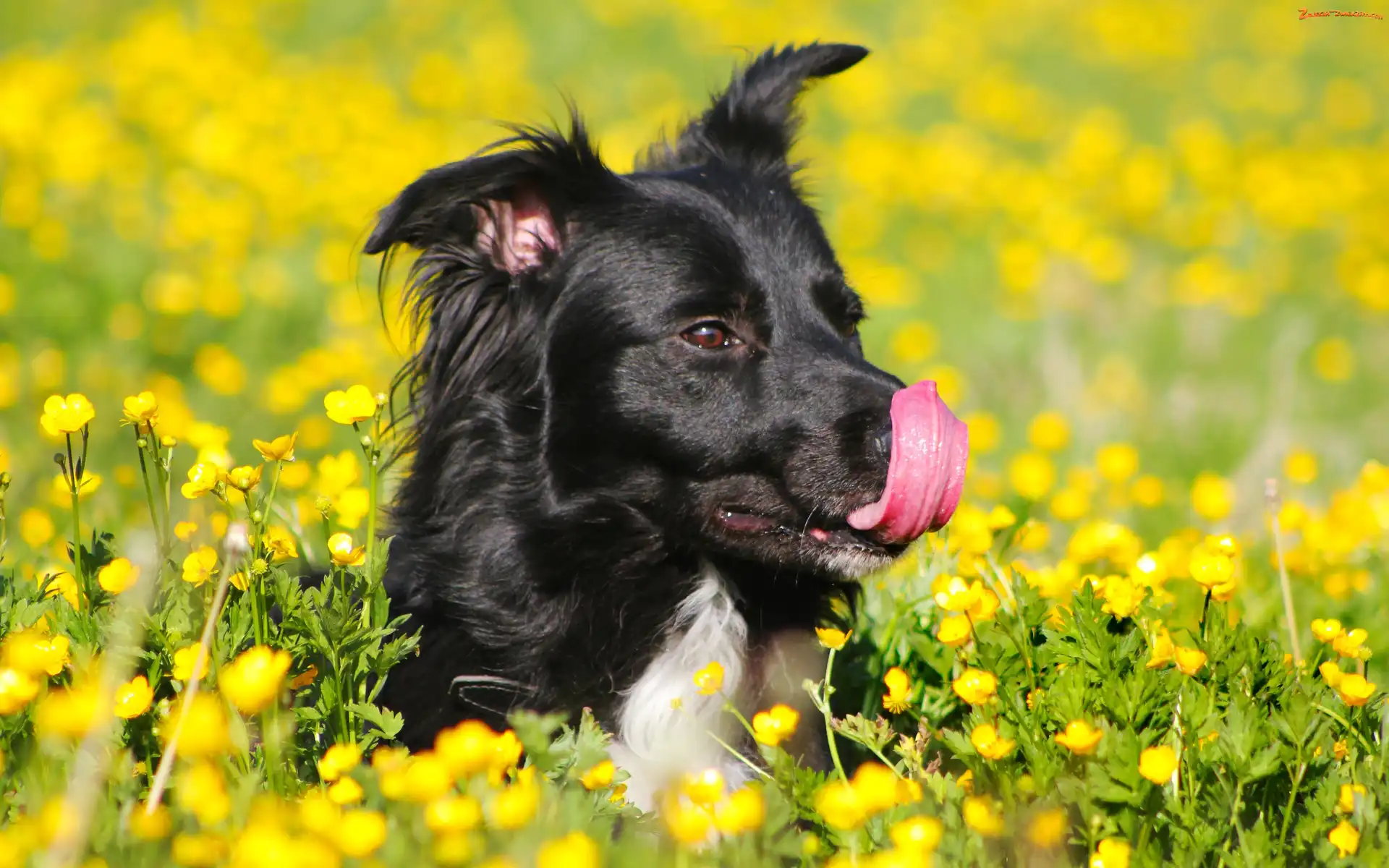 Zdjęcie: Łąka, Kaczeńce, Pies, Kwiaty