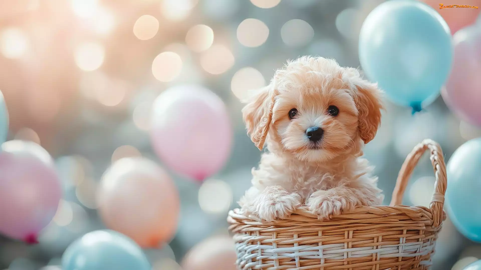 Zdjęcie: Balony, Szczeniak, Jasnobrązowy, Pies, Koszyk, Kolorowe