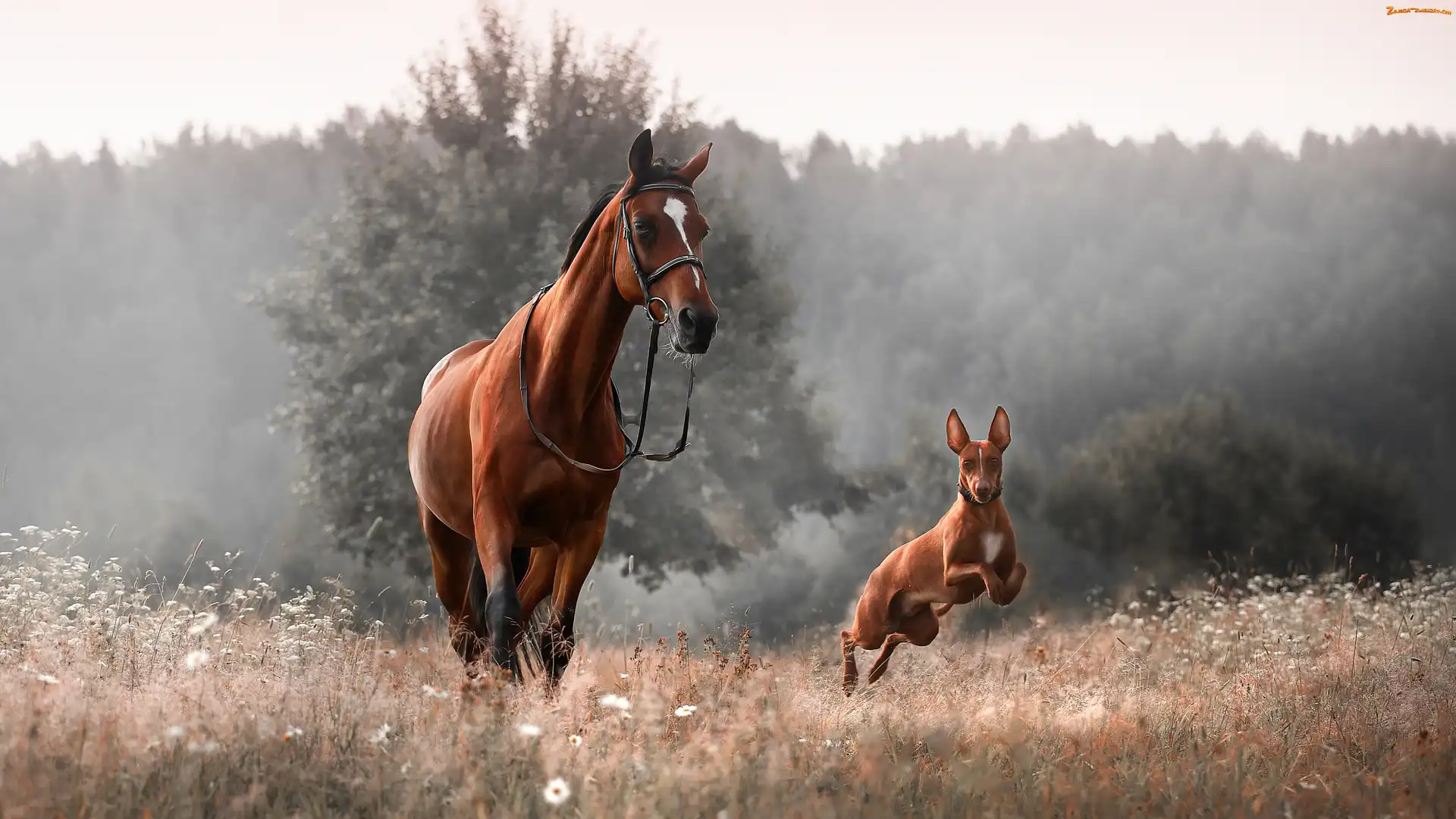Pies, Łąka, Koń, Podenco