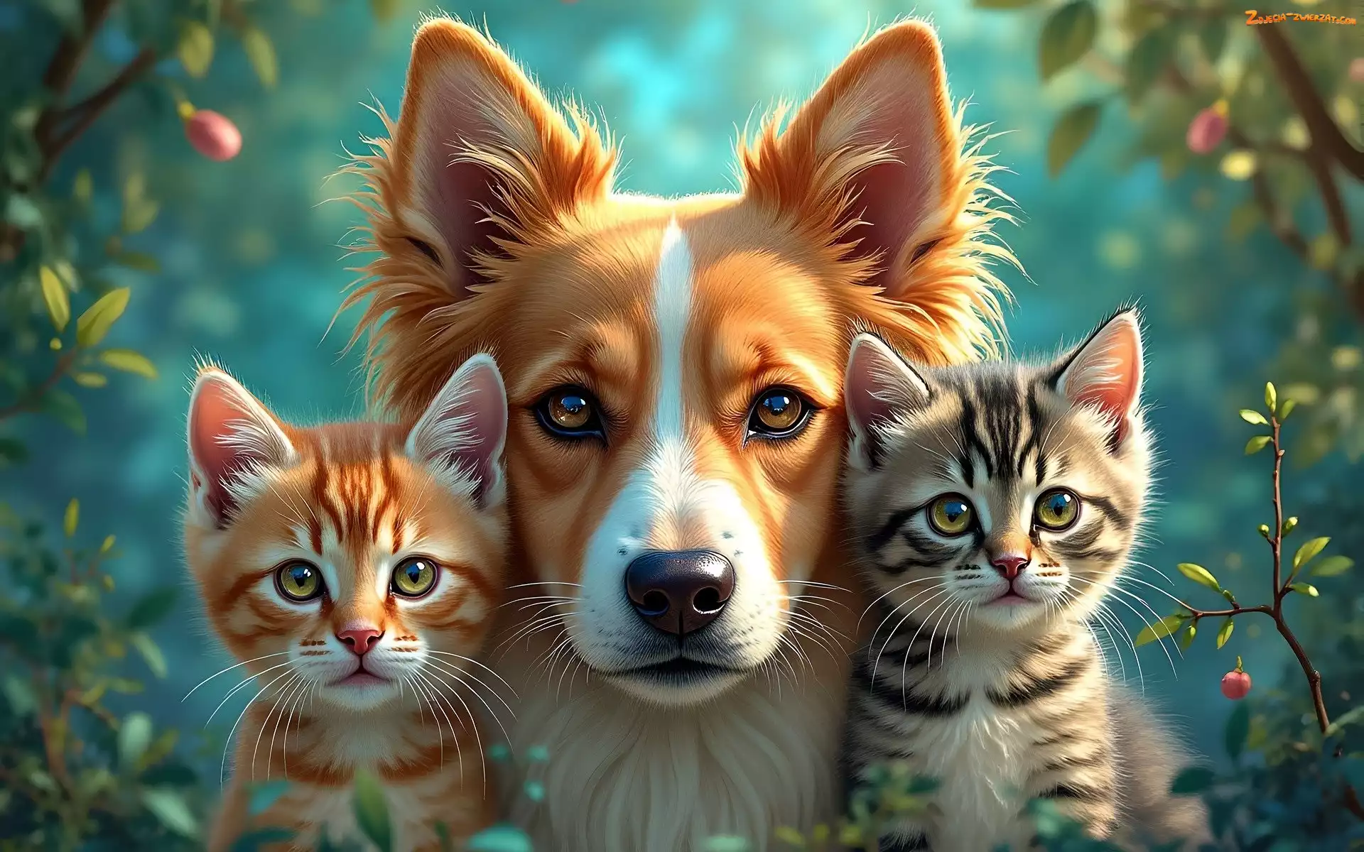 Zdjęcie: Rośliny, Dwa, Grafika, Pies, Młode, Koty