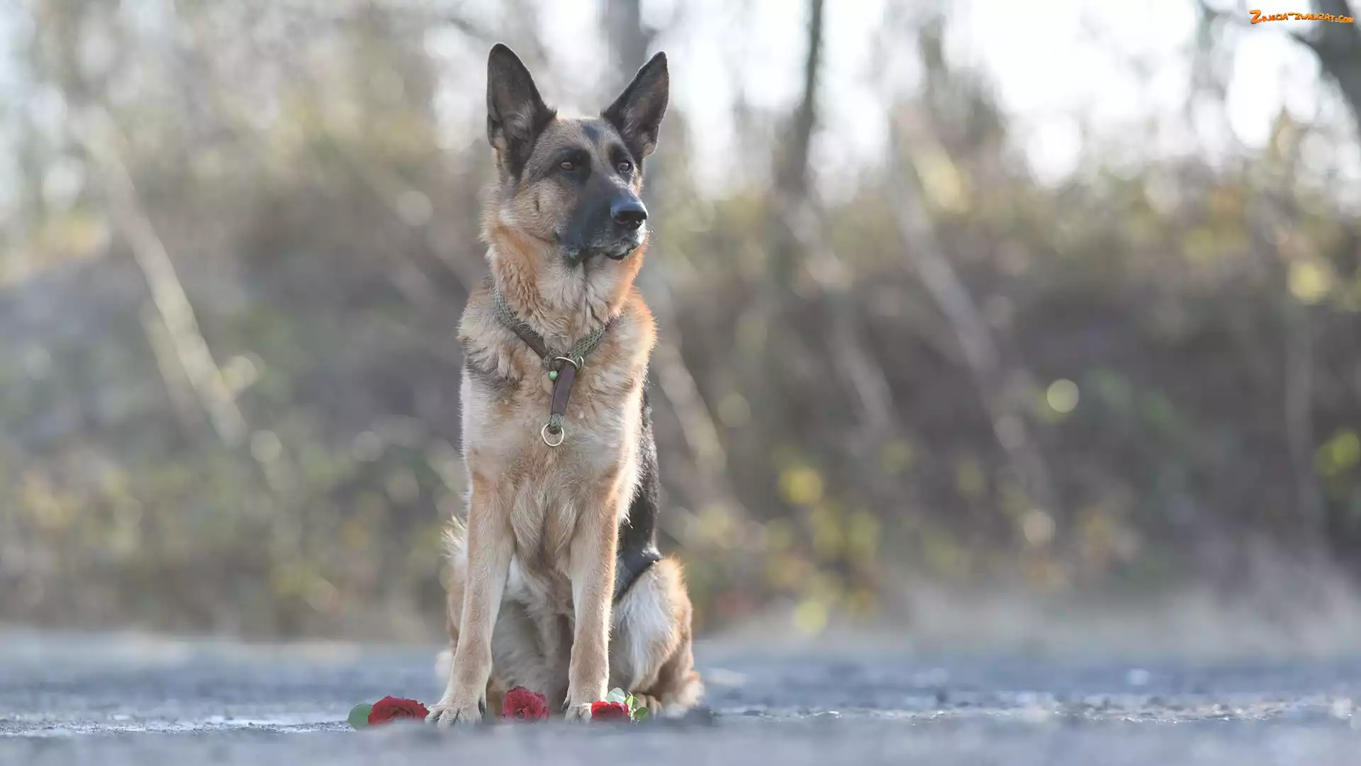 Zdjęcie: Kwiaty, Pies, Tło, Rozmyte, Owczarek niemiecki, Róże