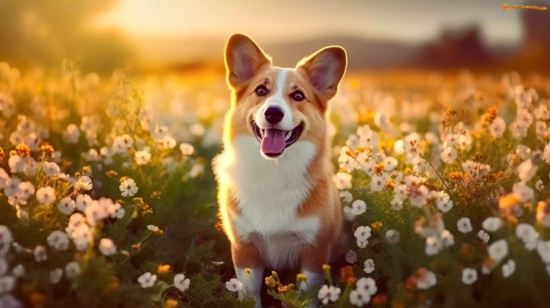 Zdjęcie: Kwiaty, Spojrzenie, Łąka, Pies, Welsh corgi pembroke