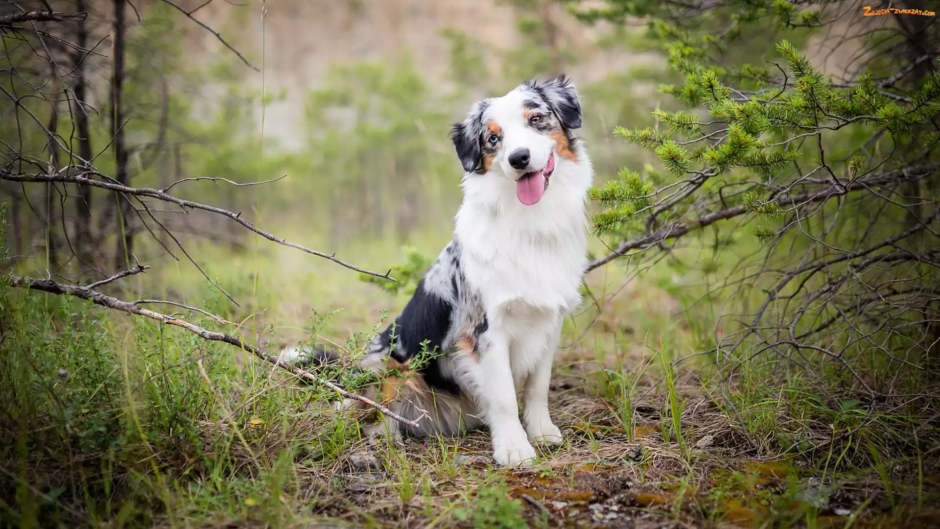 Zdjęcie: Las, Pies, Trawa, Gałązki, Owczarek australijski, Drzewa