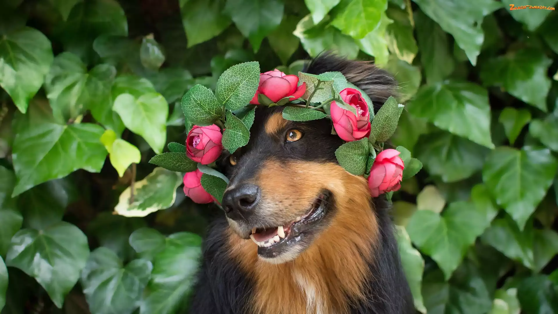 Zdjęcie: Mordka, Pies, Liście, Kwiaty, Owczarek australijski, Wianek