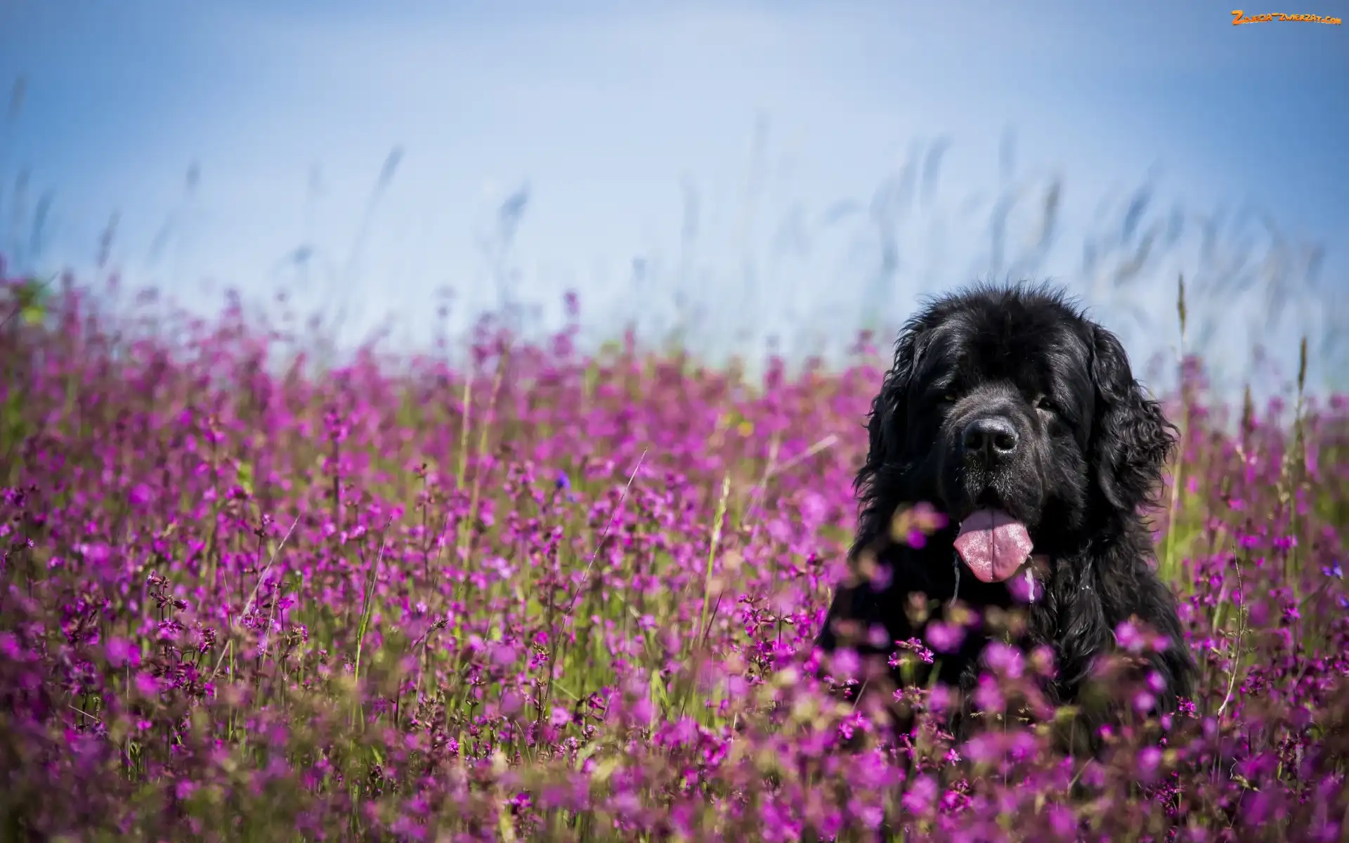 Łąka, Nowofundland, Pies, Kwiaty