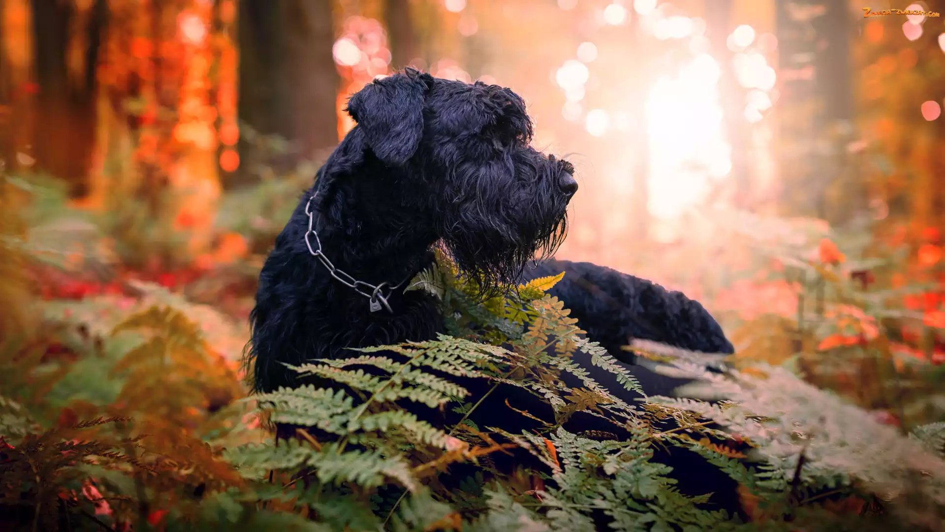Zdjęcie: Czarny, Pies, Paprocie, Sznaucer olbrzym