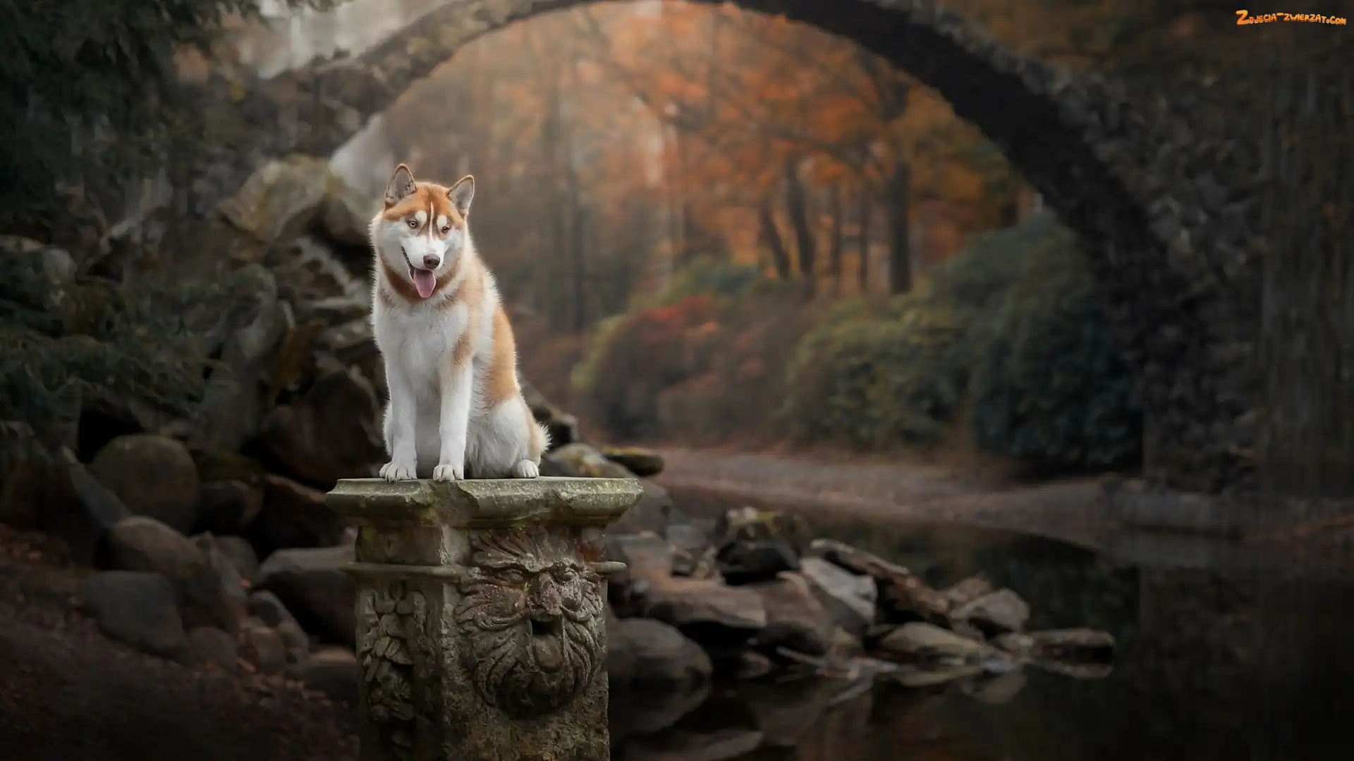 Zdjęcie: Postument, Pies, Potok, Mostek, Siberian husky, Kamienie