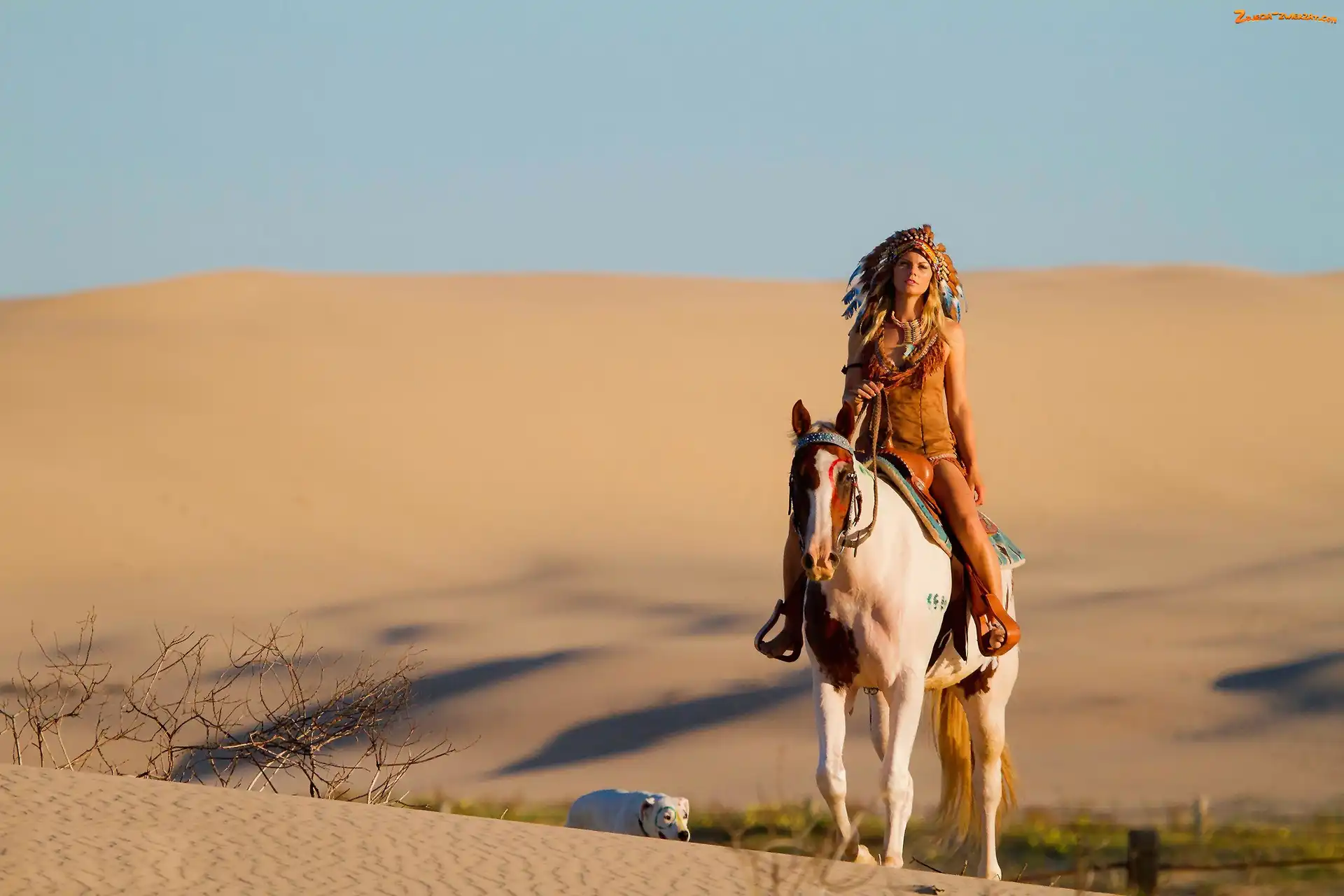 Zdjęcie: Pies, Koń, Dziewczyna, Pustynia, Pióropusz