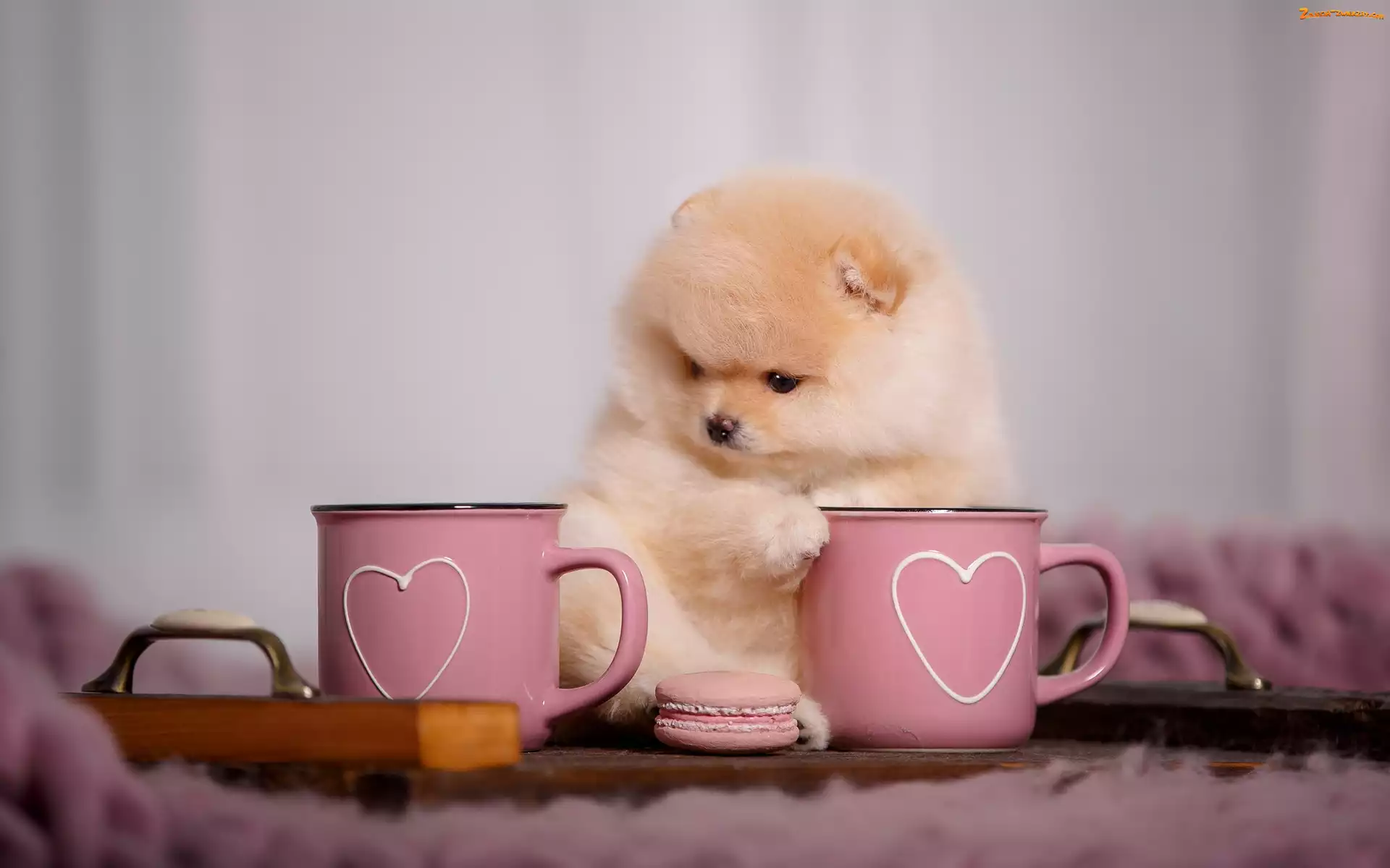 Zdjęcie: Makaronik, Pies, Szpic miniaturowy, Kubki, Ciasteczko, Szczeniak, Różowe