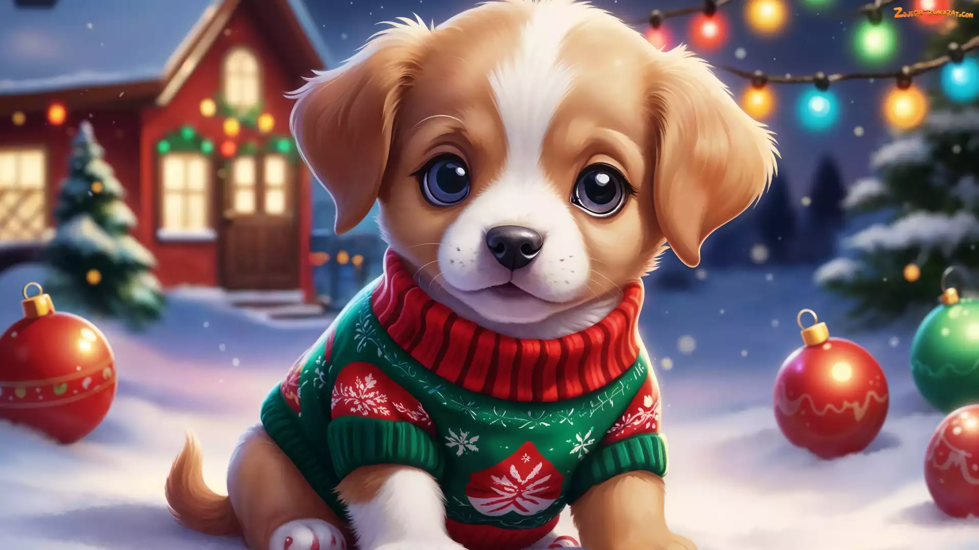 Zdjęcie: Dom, Bombki, Światła, Zima, Grafika, Śnieg, Ubranie, Pies
