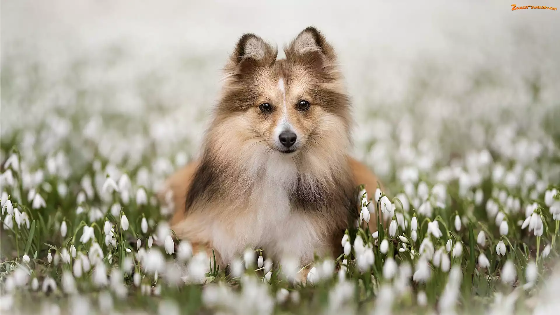 Zdjęcie: Przebiśniegi, Kwiaty, Szczeniak, Pies, Owczarek szetlandzki