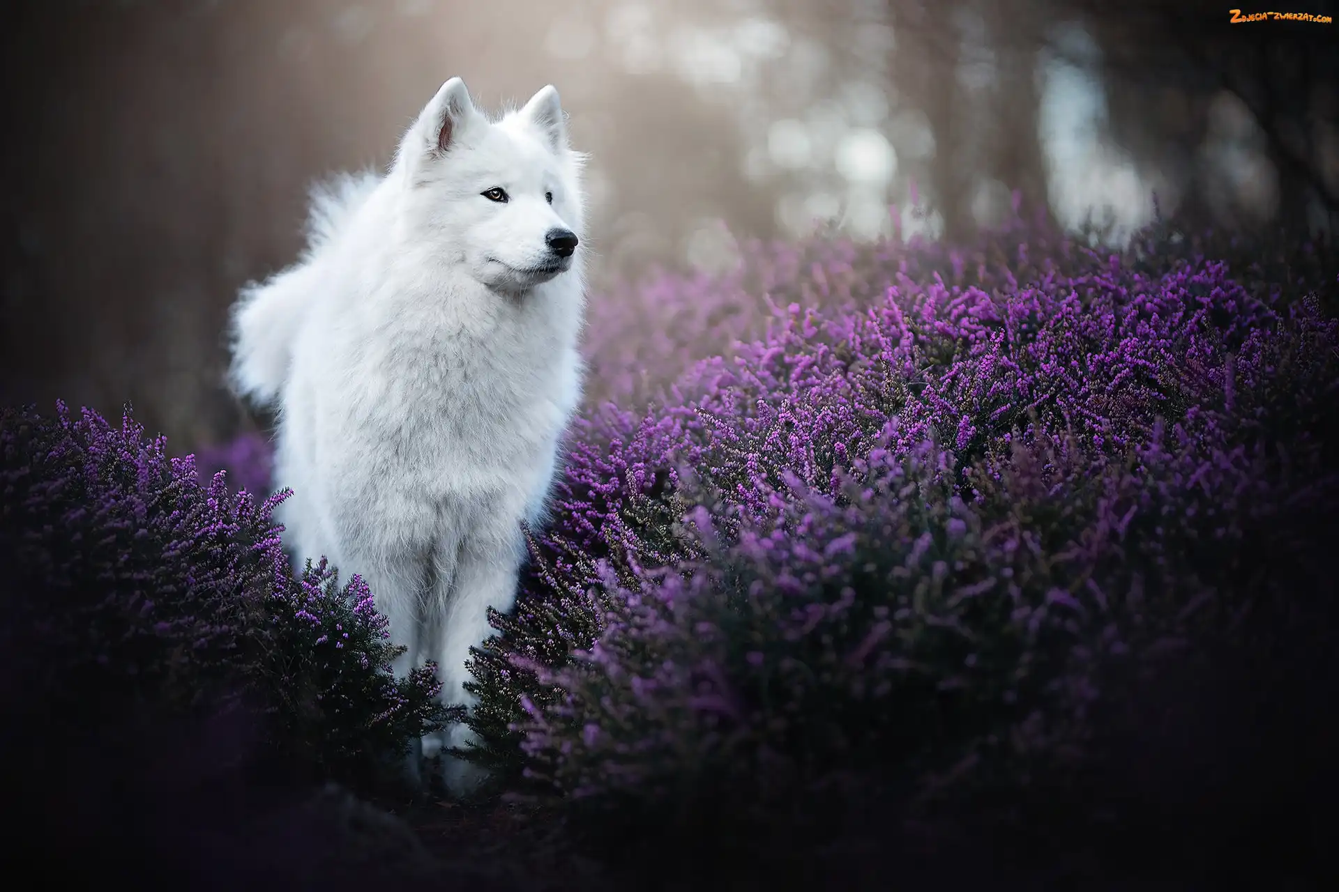 Zdjęcie: Pies, Wrzosy, Biały, Szpic japoński