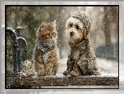 Grafika AI, Ubranka, Pies, Kot, Ławka, Zima